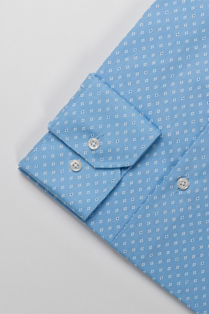 Long-sleeved cotton shirt in light blue with a white micro-dot pattern that creates the shape of a diamond and a blue micro-dot interspersed in the center. White mother-of-pearl buttons, cuff with two buttons to adjust the width and a button to adjust the opening. Composition: 100% Cotton