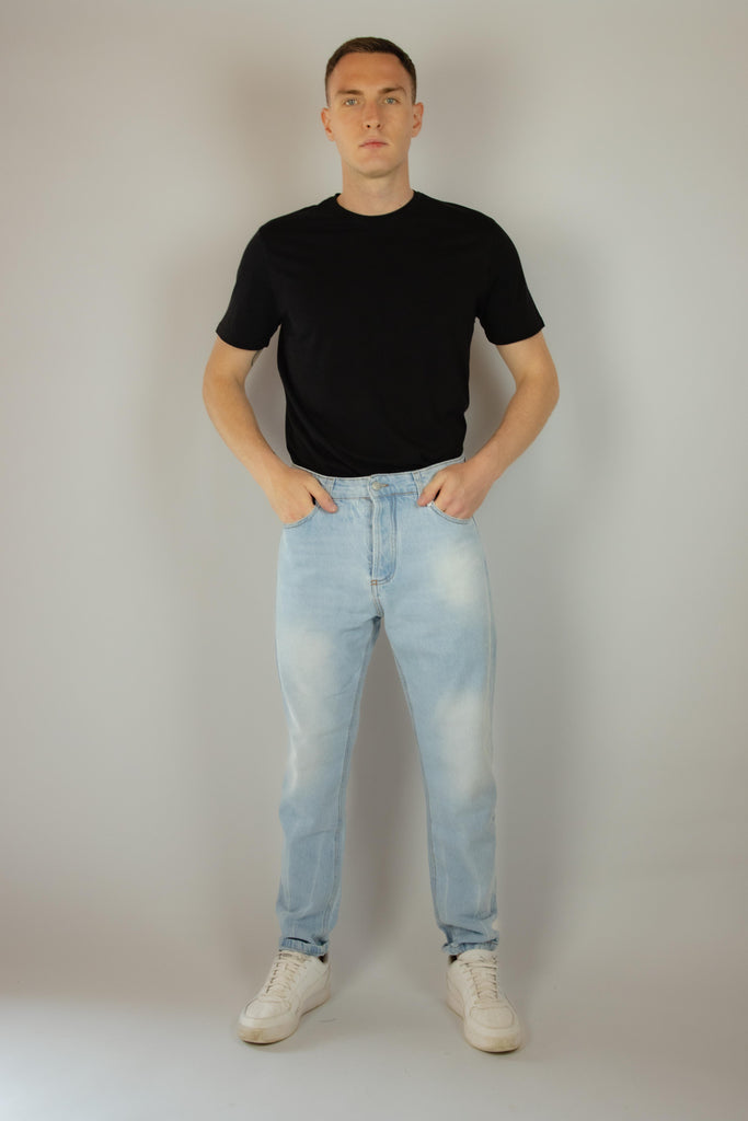 Jeans in denim lavaggio chiaro con leggere slavature davanti e dietro. Il jeans ha un lavaggio molto chiaro perfetto per la bella stagione, il modello è dritto e va a stringere in fondo alla caviglia, può essere indossato con risvolta o senza.