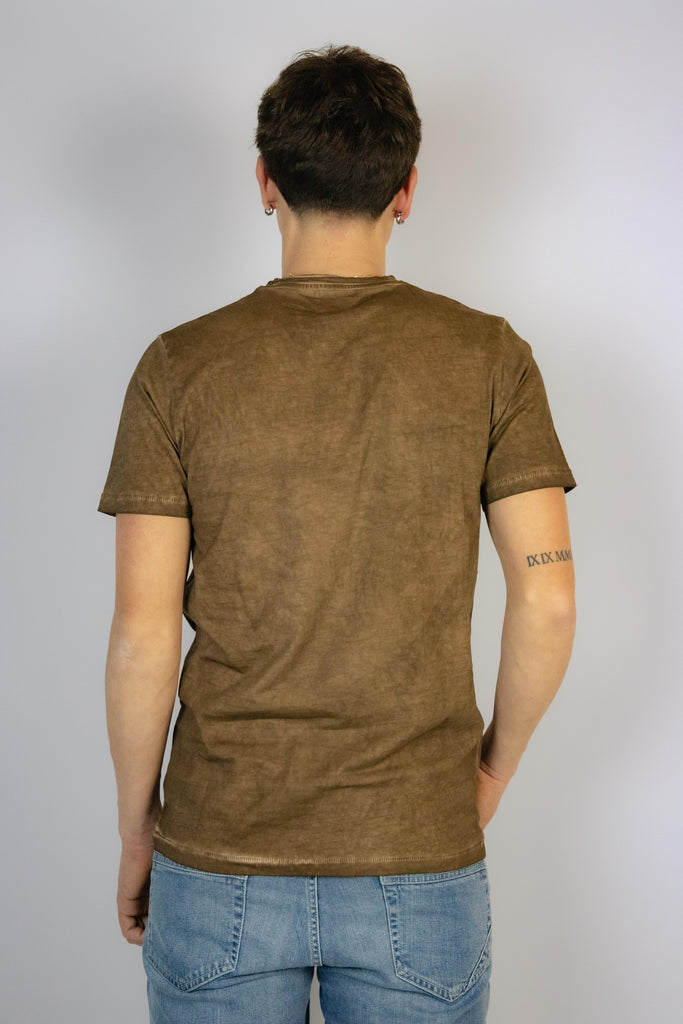 Cotton T-shirt in the color earthenware brown cold dye. The peculiarity of this short-sleeved shirt is the shaded color typical of cold dyeing, to this is added the raw cut on the neck and the tone-on-tone stitching at the bottom and on the sleeves.