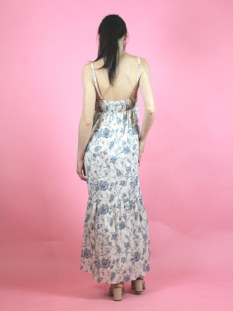 Abito lungo in cotone, fantasia floreale celeste e panna. Spallina fine e scollo a V, gonna lunga con una balza.