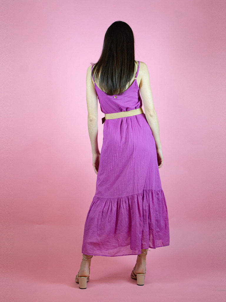 Vestito con scollo tondo, arricchito da un fiocco centrale. Cintura effetto corda in vita. Balza sulla parte finale.